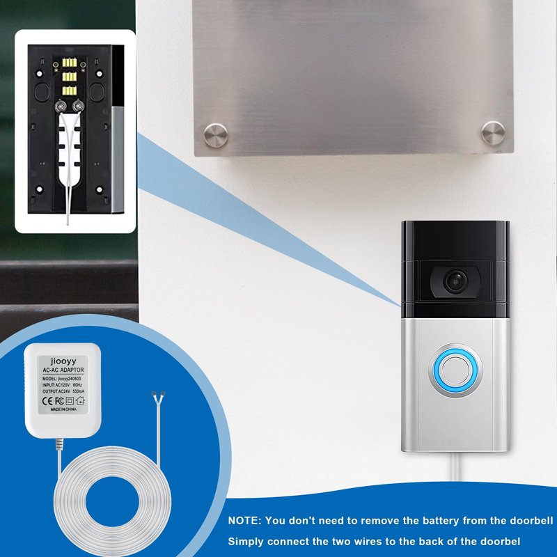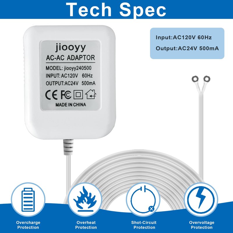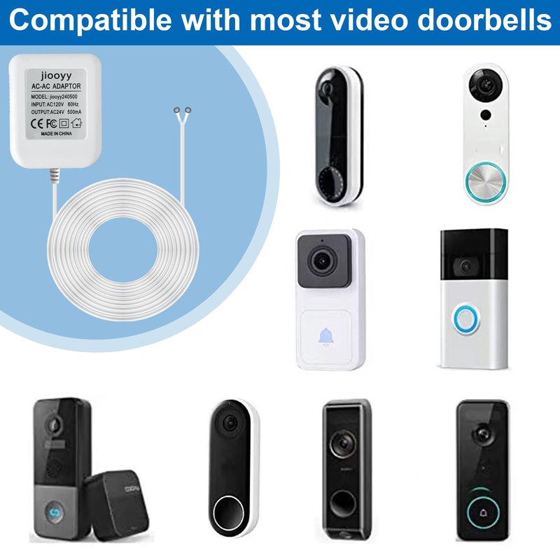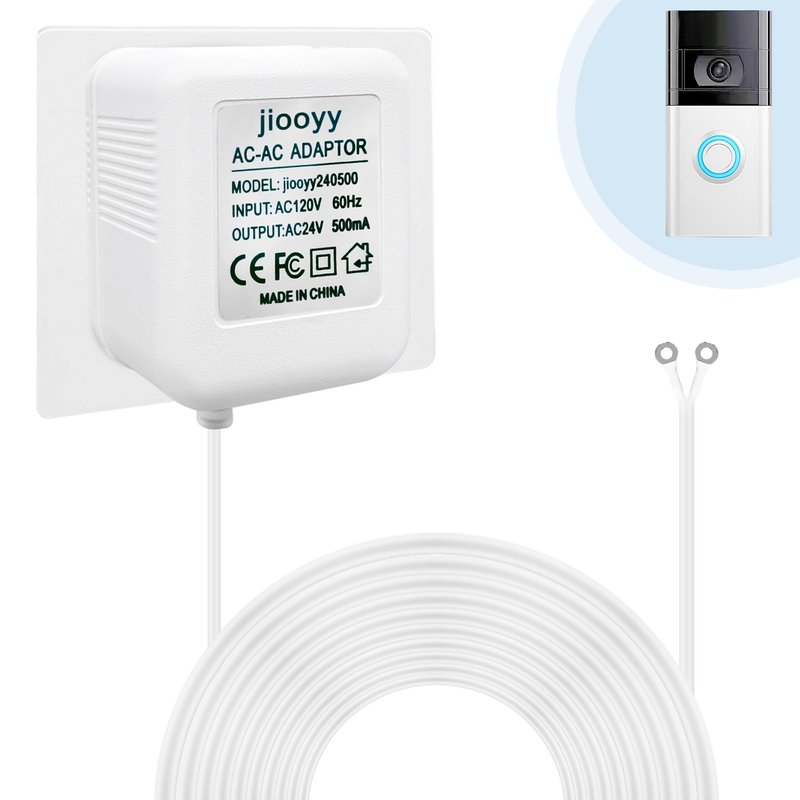 jiooyy 24V 500mA Video Doorbell Power Adapter AC110-120V to AC 24V - 16.4 feet Extension Cable, Fits Eufy, Wyze, Ring, Nest, Arlo Wireless Video doorbell Transformer(White)