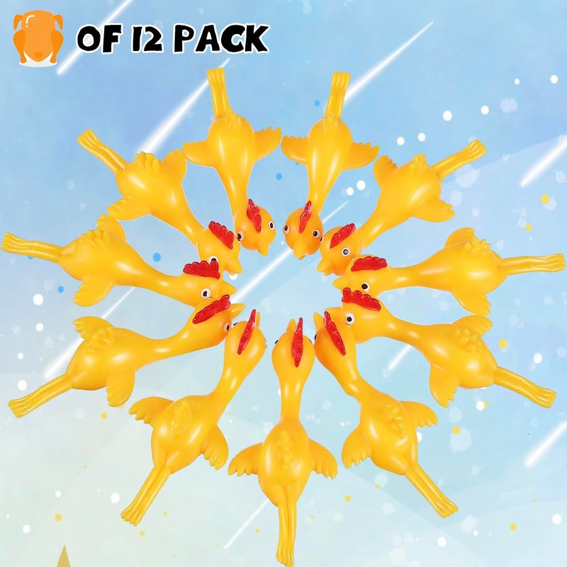 - SLINGSHOT CHICKENS BULK PARTY PACK OF 12: Each Rubber Chicken Slingshot is super stretchy and super squishy! Individually wrapped and pocket size for travel. Our mini yellow rubber chickens is the best fun little things, tiny gooey sticky slimy squishy stretchy animal toys. Flinging these slingshot chickens, fling the finger flying rubber chicken flicking finger slingers, and get the party started, enjoy the moment with your family, friends, coworkers, students, classmates and college guys!