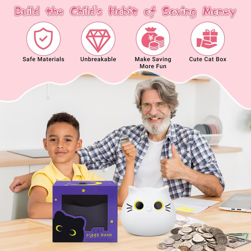 - 𝐆𝐨𝐨𝐝 𝐟𝐨𝐫 𝐁𝐮𝐢𝐥𝐝𝐢𝐧𝐠 𝐌𝐨𝐧𝐞𝐲 𝐒𝐚𝐯𝐢𝐧𝐠 𝐇𝐚𝐛𝐢𝐭𝐬: This is banks for kids enlightening, add cash and start the saving process in this kitten piggy bank safe. Fun and educational piggy bank that teaches children the importance of saving, perfect starter piggy bank for toddlers and children to develop the habit of saving.