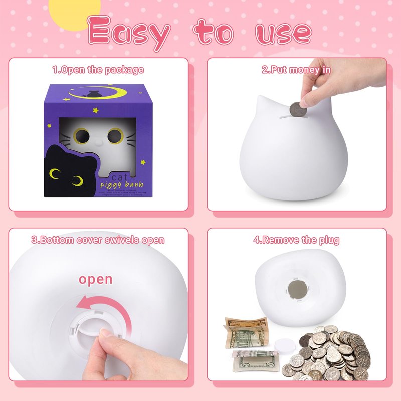 - 𝐔𝐧𝐛𝐫𝐞𝐚𝐤𝐚𝐛𝐥𝐞 𝐩𝐢𝐠𝐠𝐲 𝐛𝐚𝐧𝐤: This money saving bank is reusable, with a built-in plastic knob at the bottom, unbreakable, sturdy and safe, easy to withdraw money. This is cool banks for kids enlightening, add cash and start the saving process in this kitten piggy bank safe.