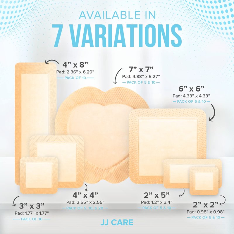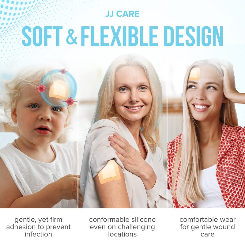 - SUPERIOR WOUND CARE – JJ CARE’s silicone foam dressings for wounds offer high absorbency, great fit, and promote fast healing for most wound types and stages. This self adhesive foam bandages for wounds helps create a conducive environment for healing by keeping the wound moist and preventing bacterial contamination/activity. JJ CARE’s silicone dressing wound use is also non-linting which is great for conditions that require regular dressing change.