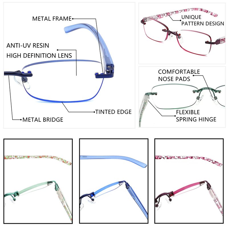 Perfect after-sales service team. Pls feel free to contact us if you have any questions. Product Features Blue Light Blocking and Anti Eyestrain Computer reading glasses with blue light protection, the substrate absorbs harmful blue light, provide all-day protection from eye fatigue and glare. Uv 400 Blocking 100% uva and uvb protection reader lenses, blocking light, diminishing damage from strong sun ray, gives you the enjoyment of a clear and comfortable vision. Trendy Frame Design Rimless reading glasses, unique pattern design on the frame and tinted lens edge, full of design which highlights the personality, makes you more eye-catching in the crowd. Professional After multiple and strict tests, professional blue light readers provide you with multiple and accurate glasses degree choices: readers 1.0, 1.25, 1.50, 1.75, 2.00, 2.25, 2.5, 2.75, 3.0, 3.25, 3.5, 4.0 glasses for women, provides you the enjoyment of a clear and comfortable vision. Excellent Wearing Experience 1. Spring hinge, flexible, suitable for different types of faces, and will not pinch your face. 2. Soft adjustable silicone nose pads, longtime wearing without fatigue. 3. The curved plastic temples are ergonomically designed, non-slip, no face clamping. 4. The metal nose bridge and the resin high definition lens are firmly fixed by high quality screws, firm and durable for longer use. What You Get 3* Reading Glasses 1* Cleaning Cloth 3* Microfiber Pouches
