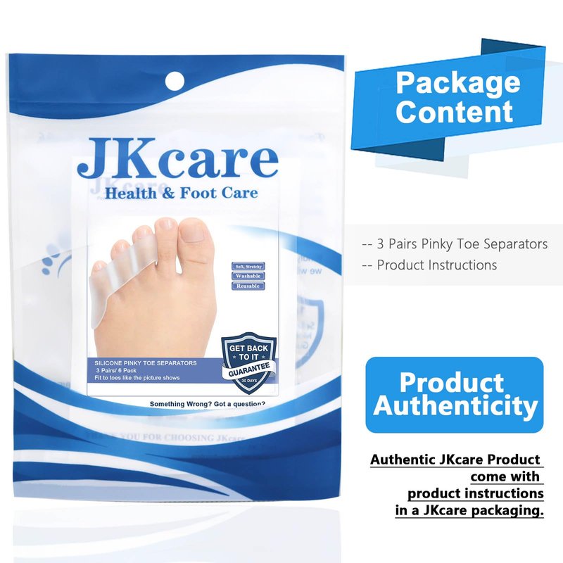 If you suffer from toe pain caused by pinky curled toe and overlapping toes, you need cushioned support to help you minimize the pain so you can stay active at home and at work. JKcare Triple Pinky Toe Separators is developed for your answer. Not only provides premium, cushioned support for standing, running, moving, our flexible toe separators can be worn on either foot both day and night, giving you the long-term comfort and support to live a healthier, happier life.