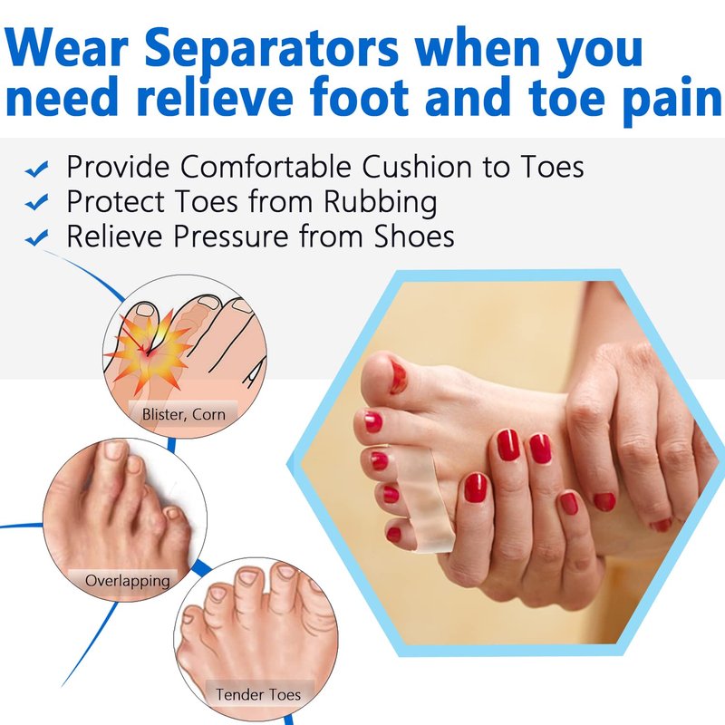 - JKcare triple toe spacers fit in small toe like the main picture show. Separate adjacent toe and prevent them from rubbing, work great for overlapping toe and curled toes. While small toes are stretched out and cushioned, foot pain and swelling can be relieved. Plus reduce the the chance of forming corn, callus, blister between toe.