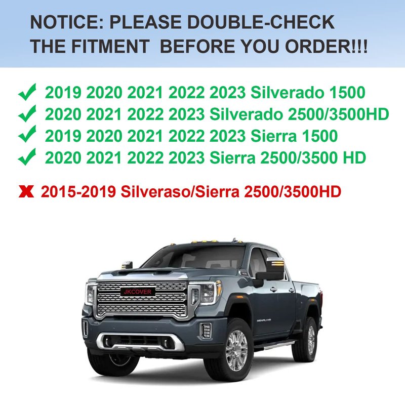 - 【Double-check the fitment models】 : JKCOVER Bed Rail Stake Pocket Covers ONLY Compatible with 2019-2024 Chevy Silverado 1500, 2020-2024 Chevy Silverado 2500HD/3500HD; 2019-2024 GMC Sierra 1500, 2020-2024 GMC Sierra 2500HD/3500HD. DO NOT FIT 2018 or older Chevy Silverado and GMC Sierra truck models. DO A QUICK CARD TEST : if the credit card can't be vertically put into the holes, it means that this product FITS your truck; If it can, it means that this product DOES NOT FIT your truck.