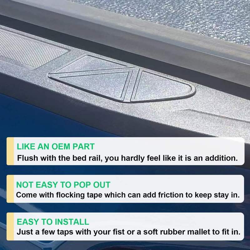 - 【No more expose and ugly holes】 : Customed according to the size of the original truck bed rail stake pocket covers, providing a sealed and clean surface for your truck bed rail to keep garbage, leaves, sand, rain, snow out of the stake holes. The stake pocket covers have the same texture as the truck bed rail, and the top unique pattern design provides a custom look for your truck bed rail.