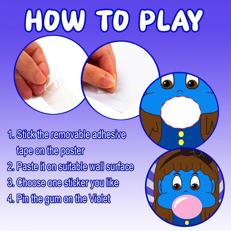 - EASY TO USE: First, stick the Violet poster on the wall or a board and you can mark a starting line. Then players choose one sticker and wear the blindfold. Try to pin the gum on the Violet . Who stick much closer, who will win the game.