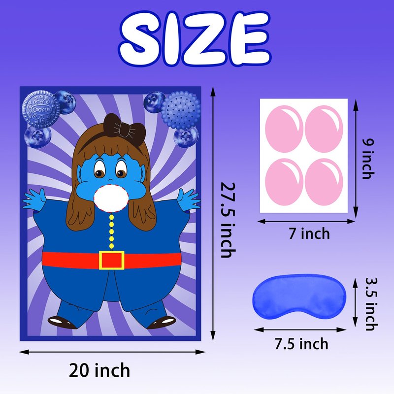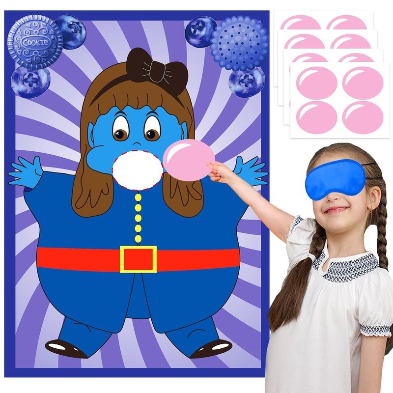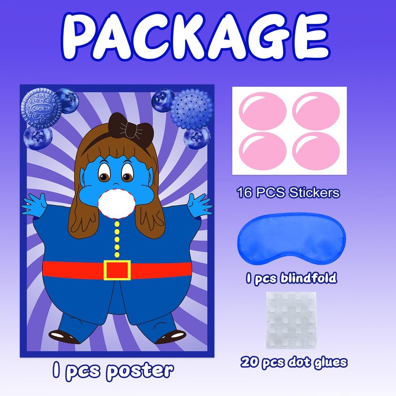 - PACKAGE INCLUDES: Pin the gum on the Violet poster party game set contains 1 piece of Violet poster, 16 piece of pink gum stickers, 1 piece of navy blue blindfold and 1 sheet of dot glues. Great games for chocolate factory movie themed birthday party and school classroom activities.