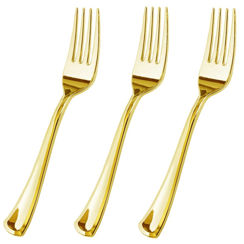 - DELUXE GOLD PLASTIC FORKS shiny metallic look makes guests think you brought out your fine forks for the occasion. This remarkably realistic forks collection always impresses your guests at special events, such as wedding, anniversary, rehearsal, shower and many more.