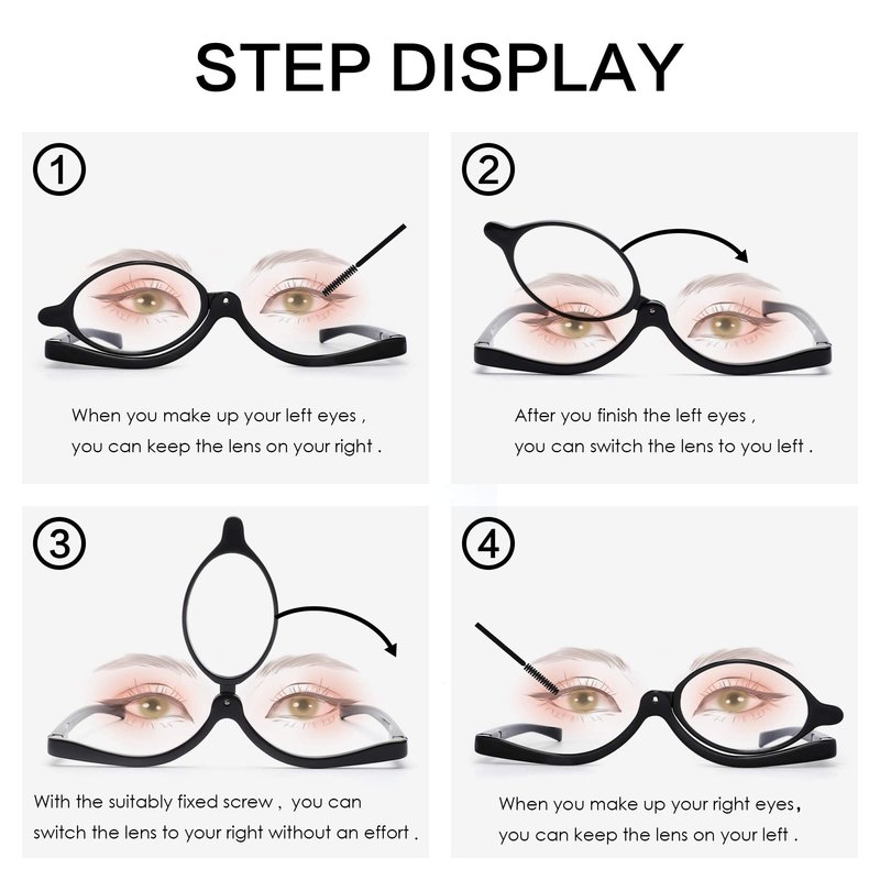 - Makeup readers with switchable lens avoid make-up trouble, like crooked lipstick, eyeliner and mascara. When you try to make up your left eyes, you need to switch the lens to your right, and vice versa.
