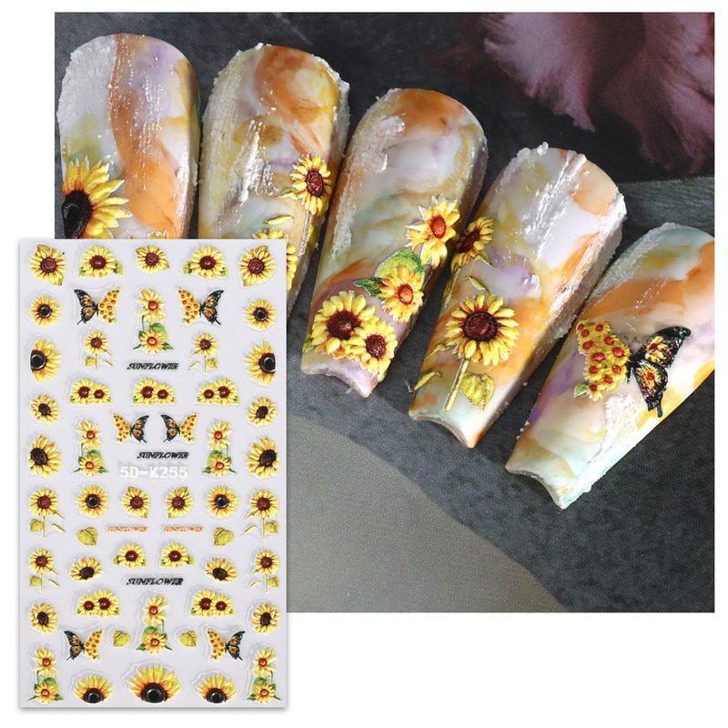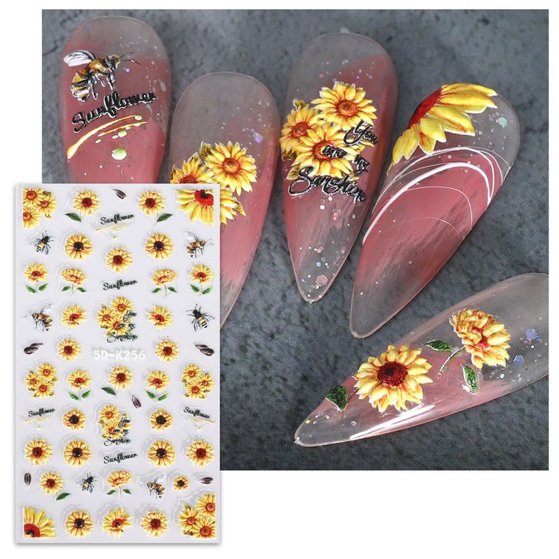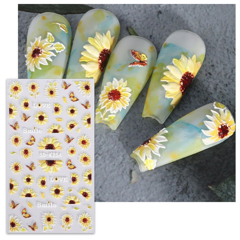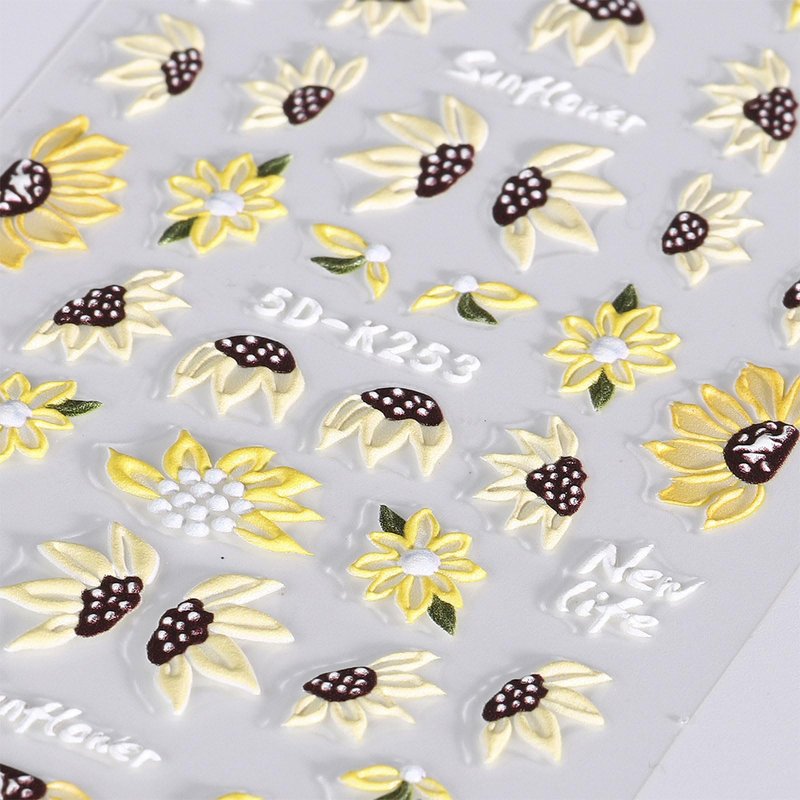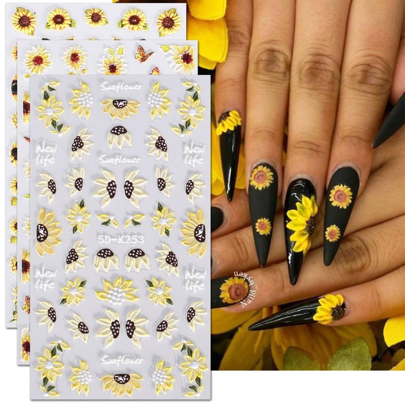 JMEOWIO 3D Embossed Flower Sunflower Nail Art Stickers Decals Self-Adhesive Pegatinas Uñas 5D Floral Daisy Nail Supplies Nail Art Design Spring Summer Decoration Accessories 4 Sheets