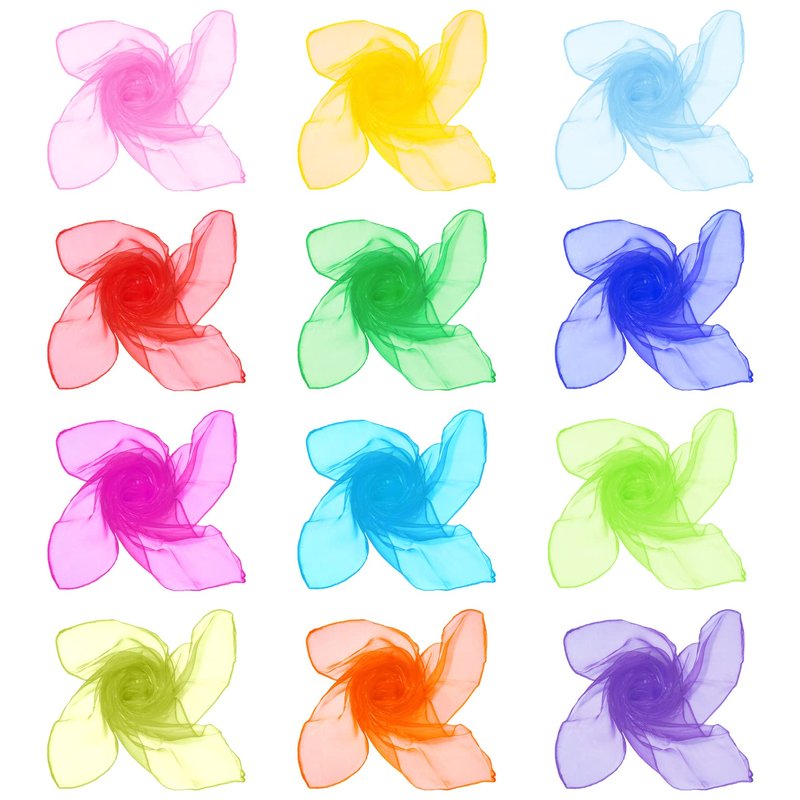 - Place Dance & Juggling Scarves Set: Package include 12 pieces square juggling silk scarves in 12 colors, red, pink, rose red, orange, yellow, light yellow, purple, green,army green, light blue, royal blue, blue, vivid color and enough quantity to meet for your different demand.