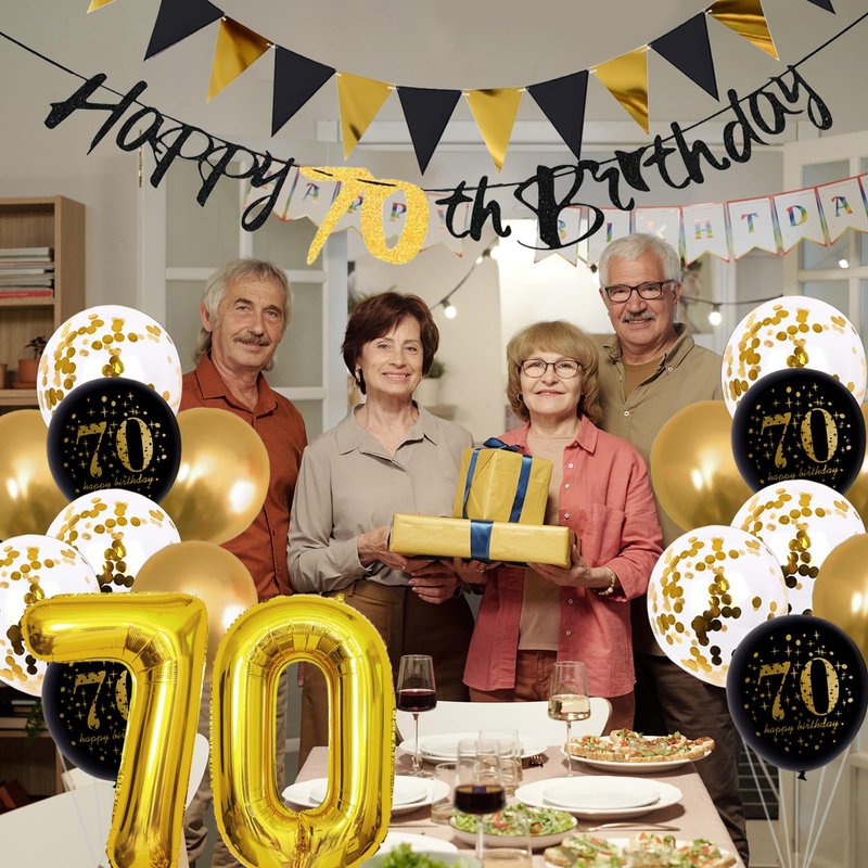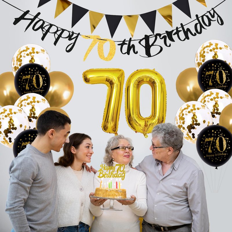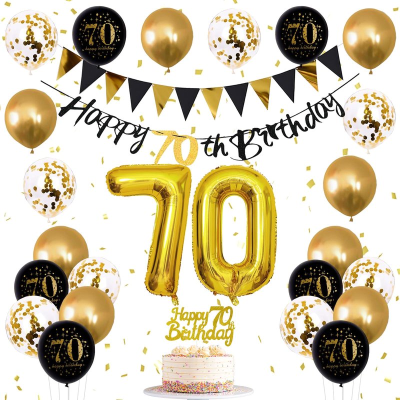 - 🎊 Black Golden 70th Birthday Decorations for men: You will get 1 pc black and gold happy 70th birthday cake topper, 1 pc gold and black triangle flag birthday bunting, 1 pc gold 70th birthday cake topper, 2 pcs 32 inch gold number 70 foil balloons, 6 pcs 12 inch black 70 balloons, 8 pcs 10 inch metallic gold latex balloons, 8 pcs 12 inch gold confetti balloons, 1pc white ribbon. Attention-grabbing black and gold party decorations for boy to make your event unforgettable.