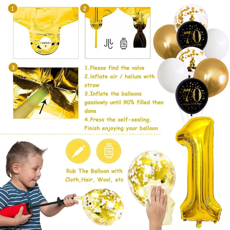 🎈 Inflatable: Air or helium. Large quantity of latex black and gold 70th birthday balloons for men set are perfect for creating a stunning balloon arch kit, balloon garland, or balloon bouquet. You can mix and match the number to create a unique and personalized look that matches your event's theme.