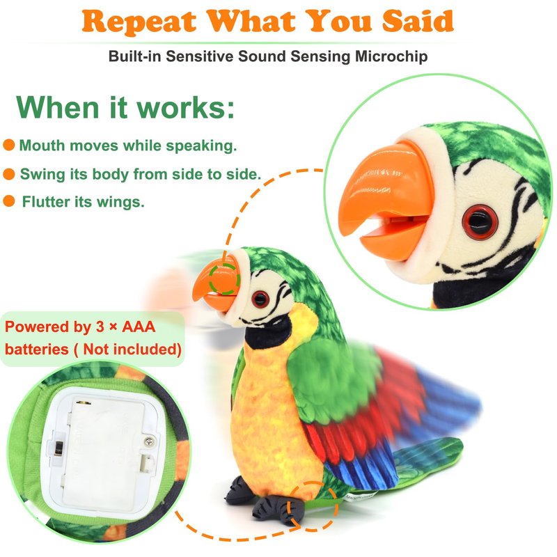 - [ Repeat What You Said ] --- This talking parrot has a sound sensing microchips. Once it hears a sound, it will repeat the voice one time. When it pepeat what you said, it will flutter its wings and shake head at the same time, it repeats everything you said, really a cute toy.