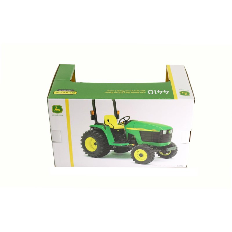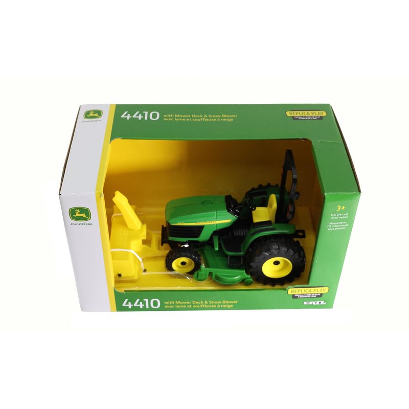 1/16 John Deere 4410 with Mower Deck and Snow Blower Toy - LP83254. Features mower deck and snow-blower attachments. Configured with MFWD front axle, single rear tires, open station with fenders, and ROPs bar. Age grade: 3+ 1/16 Die-Cast Metal replica. Made of some plastic parts. Measures approx.: 6.5" x 4.5" x 3.5" This is a Licensed John Deere Product.