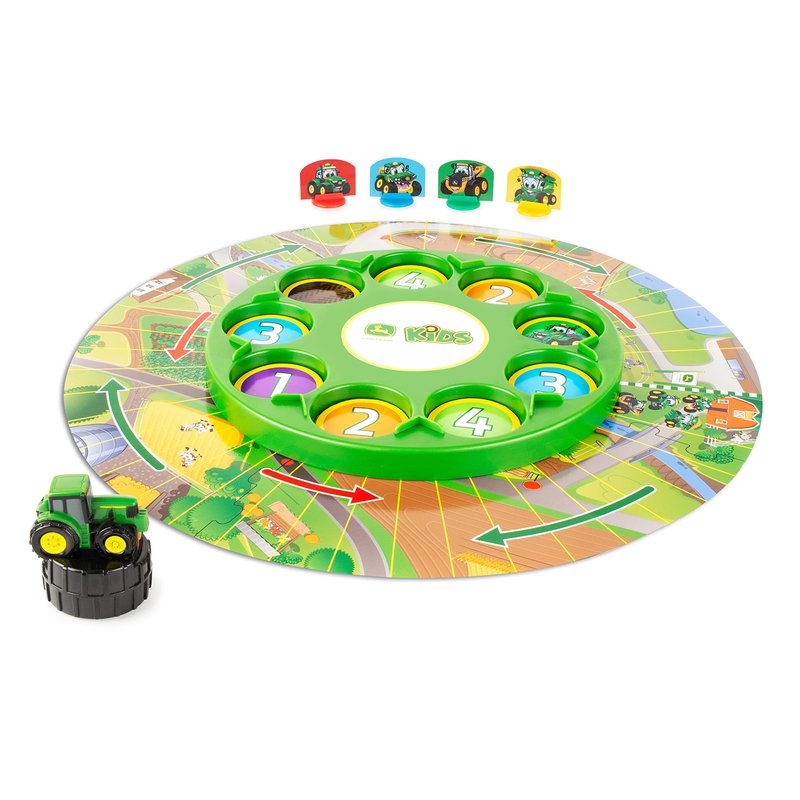 - Comes Complete: This kids game includes John Deere themed game board, 4 game board panels, 9 action disks, 4 character pieces with holders, tractor spinner, and instruction sheet