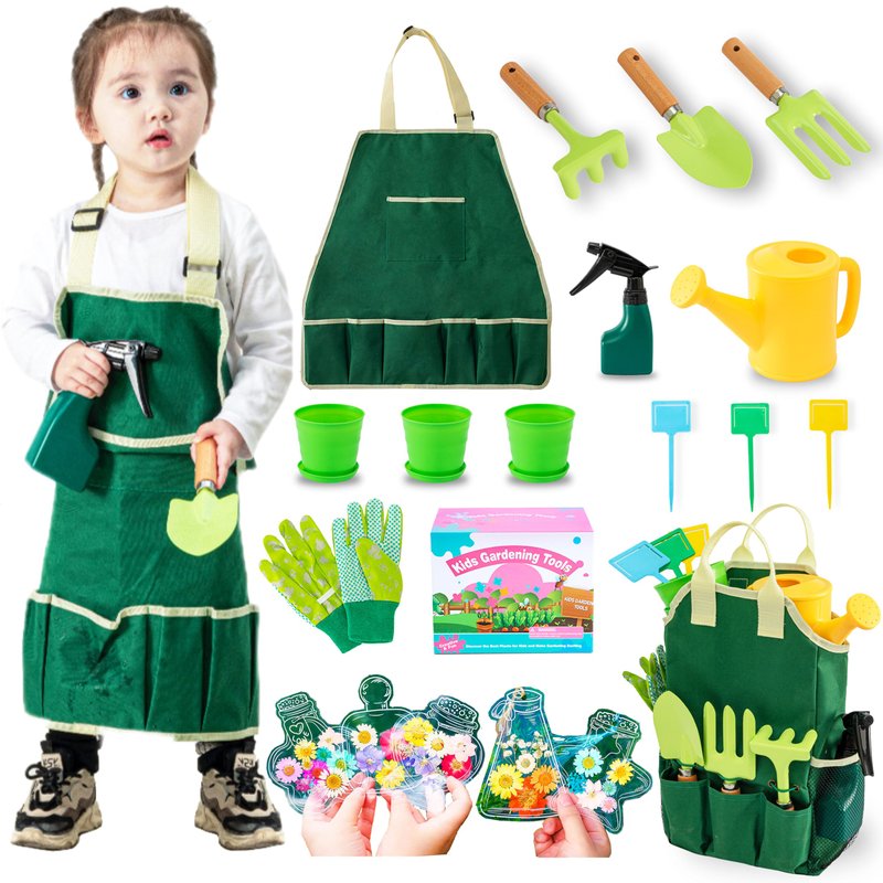 - 🌱【Complete Kids Gardening Set】Comes with everything your child needs to explore the joys of gardening! This comprehensive set includes a wooden handle alloy rake, fork, trowel, watering can, gloves, apron, tote bag, plant pots, and DIY bookmark kits.