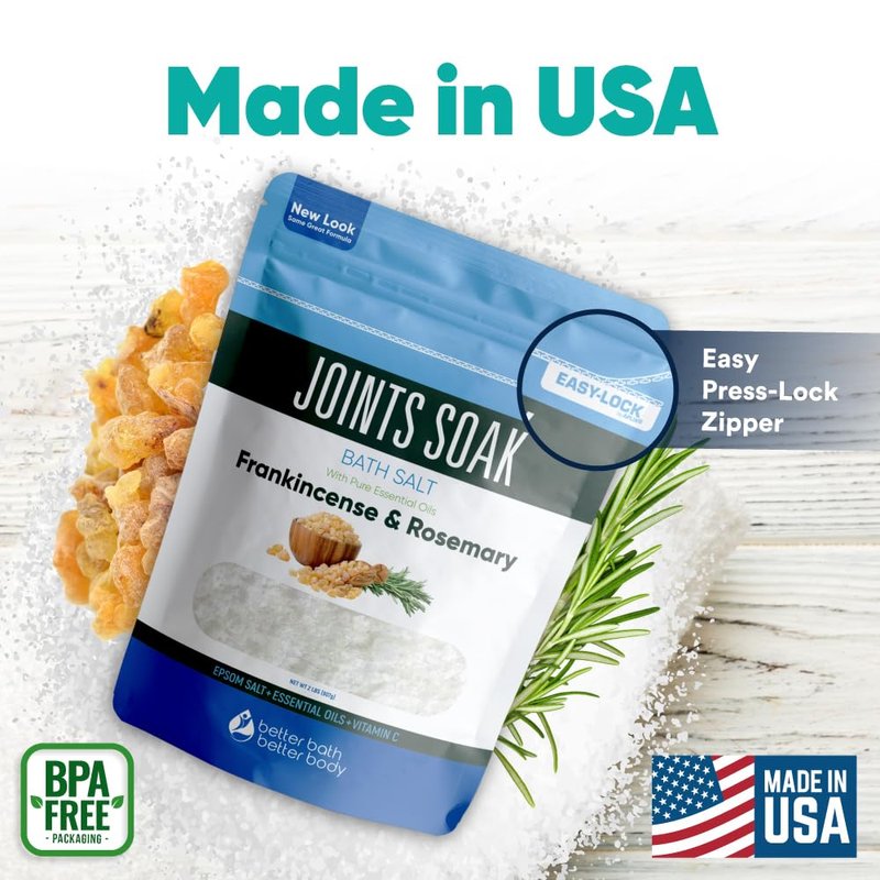 Joints Soak Bath Salt 32 Ounces Epsom Salt with Natural Rosemary, Frankincense and Peppermint Essential Oils Plus Vitamin C in BPA Free Pouch with Easy Press-Lock Seal