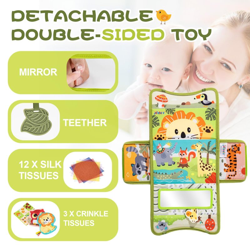 Side two: A vibrant jungle scene that's begging for imaginative play. Little one loves to "explore" the jungle and "feed" the animals (which usually involves a lot of drool and giggles).And tissue box toy with the built-in mirror, he can even admire his own "jungle adventures" – talk about a confidence boost!