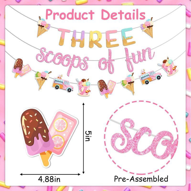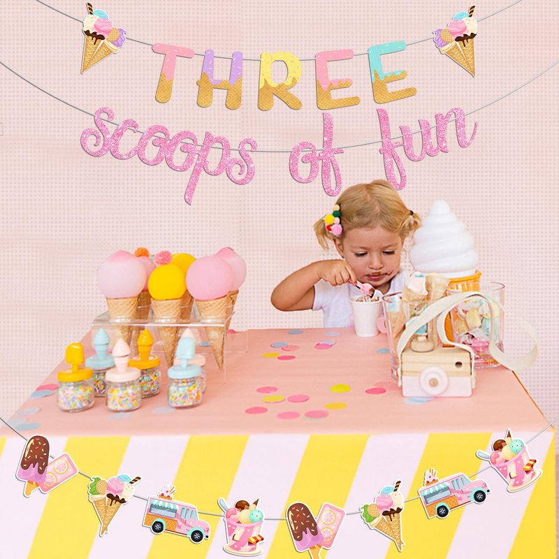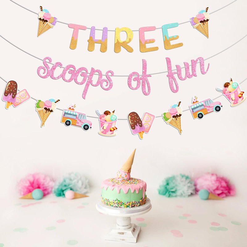 Ice Cream 3rd Birthday Party Decorations Includes: 1 x three scoops of fun banner 1 x ice cream banner garland