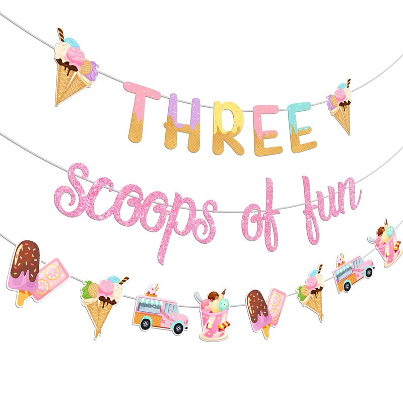 - Package Includes: You will receive 1 x three scoops of fun banner, 1 x ice cream theme banner garland, which can help you hold an unforgettable ice cream 3rd birthday party