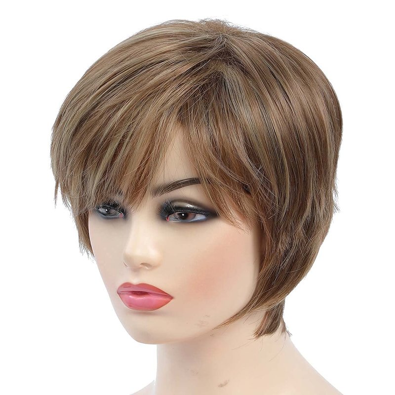 JOLNVCA Pixie Cut Layered Short Brown Wigs with Bangs Straight Synthetic Hair Wigs for White Women (Blonde Mixed Brown)