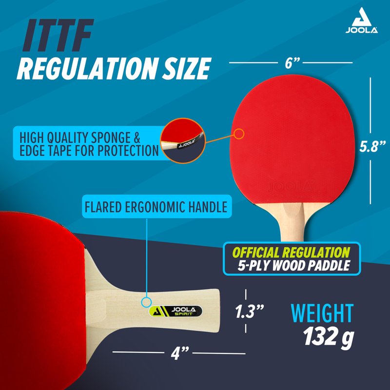 - INCLUDES: 4 Spirit Training Table Tennis Paddles, 5 White 40mm regulation ping pong balls, 5 Orange 40mm regulation ping pong balls, and a convienent portable carrying case. Great gift for someone who already owns a JOOLA ping pong table!