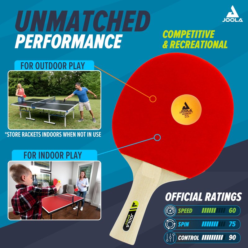- UNMATCHED PERFORMANCE: The JOOLA Family Table Tennis Paddle Set has official ratings of Speed - 60, Spin - 75, Control – 90. Ideal for recreational, regulation or competitive play with friends and family.