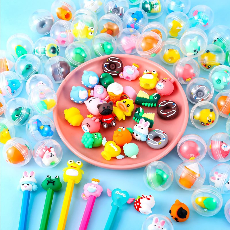 - Package Includes: you will receive 100 pieces of toy capsules in clear color, each mini capsule contains a cartoon toy that can be used as pencil toppers; These gumball balls toy is about 1.3 inches/ 3.2 cm