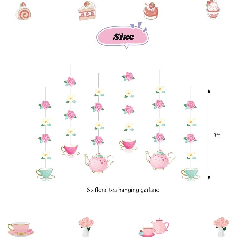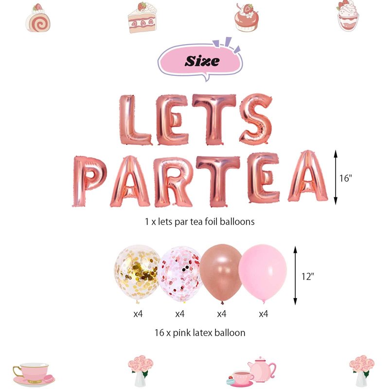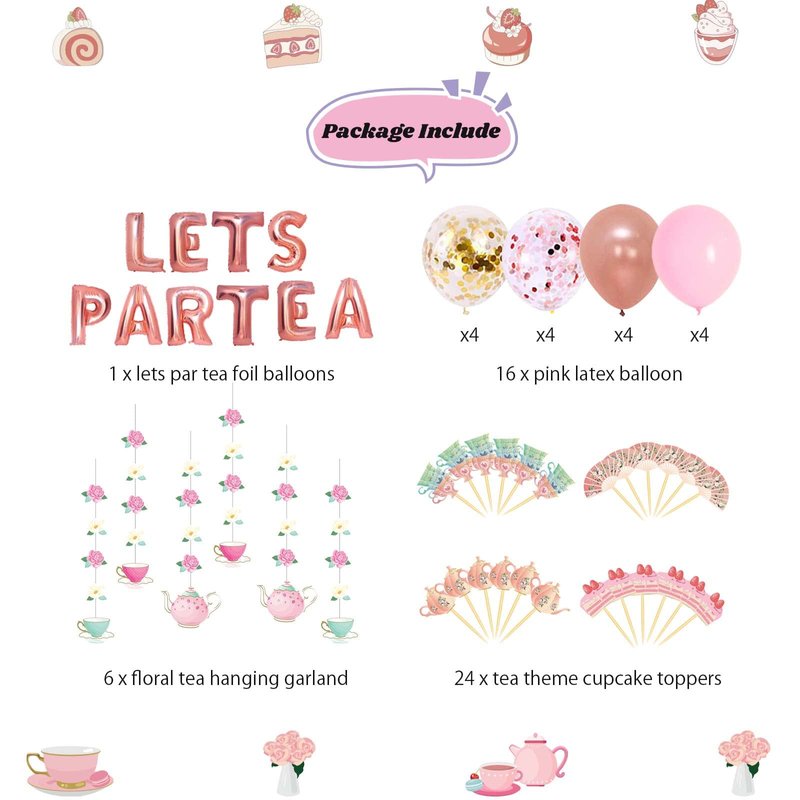 - š°ćTea Party Package Includeć: 1 x LETS PAR TEA foil balloons(16"); 6 x floral tea hanging garland(3ft ); 24 x tea themed cupcake toppers; 16 x pink latex balloons(12").