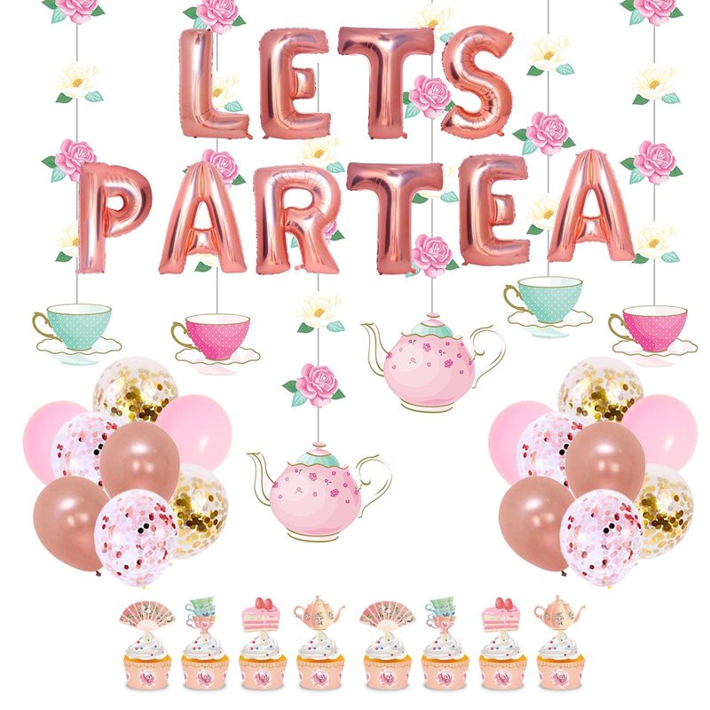 - š§ćEasy To Assembleć: The LET'S PAR TEA foil balloons can be easily set up as backdrop or banner with the glue dots and ribbons. Floral tea party hanging decorations and tea themed cupcake toppers are pre-assembled.