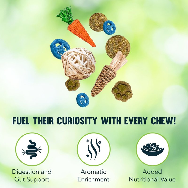 - Happy Tummies, Happy Bunnies --- Our munchies are fiber-rich and work wonders for your pet's stomach to be in tip-top condition. Each pack contains rattan carrots & balls, timothy hay (sticks & paw-shaped), cinnamon sticks with timothy hay pie, wood ladder, calendula balls and loofah slices that satisfy their taste buds. The combination of a wholesome blend ensures that your pets will be in prime condition for all the hopping adventures.