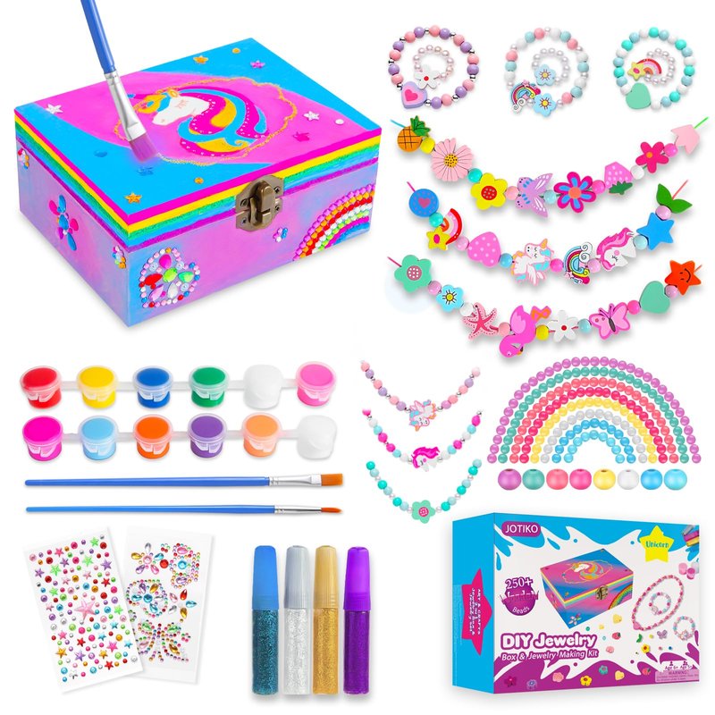 JOTIKO Arts and Crafts for Kids Girls Age 6-8, Paint Your Own Jewelry Box & Bracelet Making Kit, Unicorn Toys for Girls 8-12 Years Old, 250PCS Wooden Beads Charms Jewelry Making Kit Christmas Gift