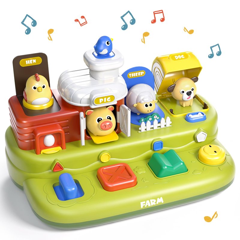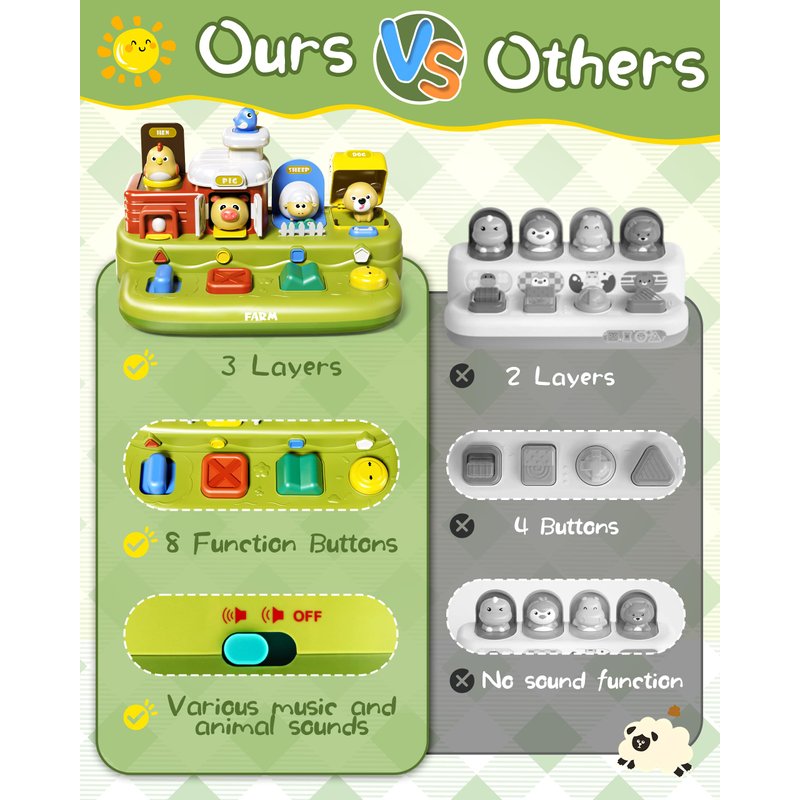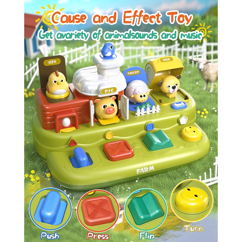 - 【Upgraded Farm Animal Toy】Upgraded 3-layer toy comes with 4 kinds of animals and 8 brightly colored buttons. pop animals up by triggering (push/turn/flip/press) buttons. Great for sensory exploration and early development.