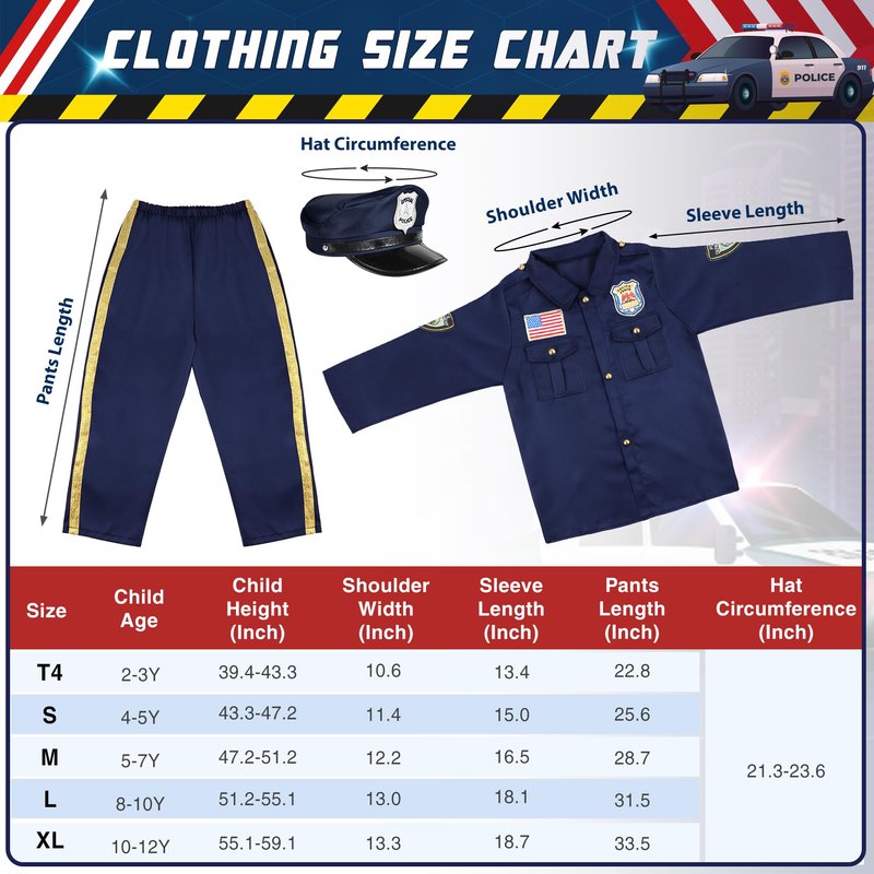 - SIZE & NOTE - Our kids police costume offers 5 sizes to fit most children, they are T4(3 yrs), S(4-5 yrs), Medium(5-7 yrs), Large(8-10 yrs), and Extra Large(11-12 yrs). The measurement results in the size chart are manually measured, and there may be an error of 1-2cm with the actual size. We recommend using height/chest and waist measurements to determine which size your kid will fit. If at the top of the size range, please consider moving up a size.