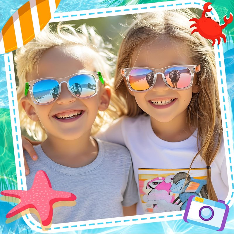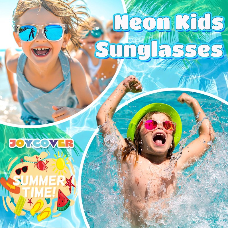 - 【UV 400 Eye Protection & Polarized Lens】Our bulk kids sunglasses are made of UV400 protection lenses, which protect your kid's eyes from the sunshine perfectly. At the same time, polarized lens will restore true color and provide clear vision. In addition, the lens of each kids neon sunglasses is colorful and will show different colors in different lights and angles. It totally look like jelly very much. Perfect for summer beach parties, summer vocations, pool parties, and outdoor activities.