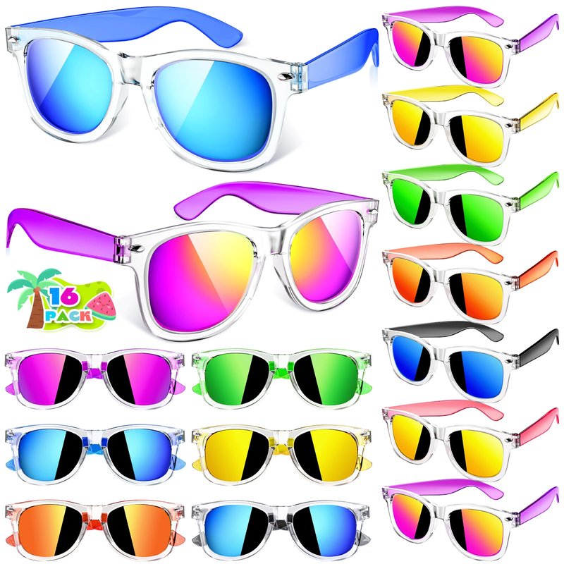 - 【Bulk Sunglasses for Kids Age 3-8】 Our kids sunglasses party favor come with 16 pack sunglasses bulk. The legs of this bulk sunglasses come in 8 color(blue, purple, orange, yellow, green, black, tangerine, Rose pink). The frame of each pair measures 5" W x 1 3/5" H x 5 L. Specifically for kids ages 3-8. It’s very suitable for kids as pool party favors, beach party favors, summer party favors, party favors for kids goodie bags, end of the year gifts for students, Party Favor for Kids 4-8, etc!