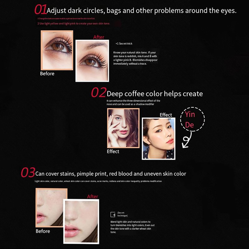 The highlighter concealer contour kit have 12 shades, light to medium, medium to dark, providing total camouflage for almost any skin tone problem including blemishes, scars, birthmarks and black circles and pox.