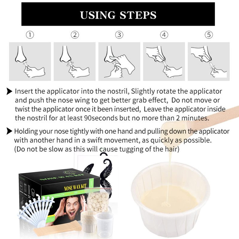 - Wax Nose Hair Removal Kit at Home Salon - Nasal nose hair wax kit package include 50 grams hypo-allergenic nasal wax, 10 nose wax sticks, 10 nose wax paper cups, 1 mustache protecotr, 5 wooden applicators, 1 measuring cup and user manual, one-stop ear hair, nose hair and eyebrow remover, results last for up to 5 weeks.
