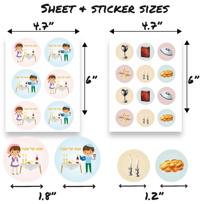 --Assorted Shabbat Stickers for kids with 8 sheets and over 70 large colorful fun stickers, including shabbat-themed images like shabbat candles, challah, jewish kids, kidush wine and more - Functions: Create a unique one-of-a-kind arts and crafts project with this fun sticker set. The stickers are perfect for Shabbat School activities, Shabbat art & craft for kids, make-your-own Shabbat decoration, Shabbat gift bags, shabbos toys for kids, jewish sticker activities, and more-- Easy to use: Shabbat Shalom stickers have very strong quality adhesive material, making them very easy to peel and stick for young kids and toddlers. This is a clean, mess-free, and easy-to-use craft item for Jewish school and home! -- Applications: use Shabbat stickers on kids' craft projects, Hebrew school and Jewish school activities, envelopes decor for Shabbat, scrapbooks, candy bags decoration, and Shabbat favors -- Specifications: The Shabbat kids set of stickers is made from high-quality paper. Sheet size 4"x6". Stickers size 1"-1.8"