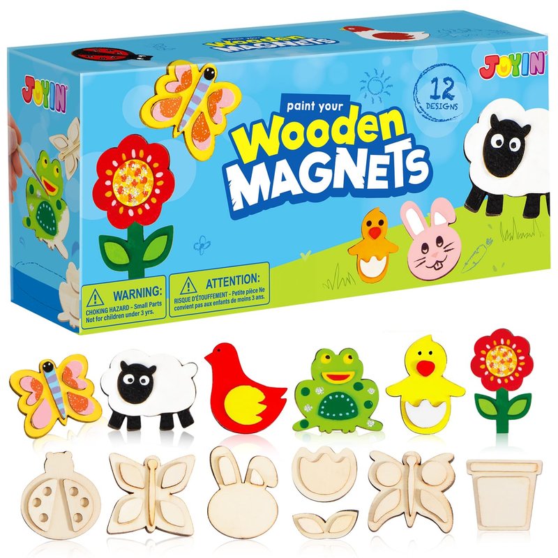 JOYIN 12 Wooden Magnet Creativity Arts & Crafts Painting Kit for Kids, Decorate Your Own Painting Gift for Easter Basket Stuffers, Birthday Parties and Family Crafts, Party Favors for Boys Girls