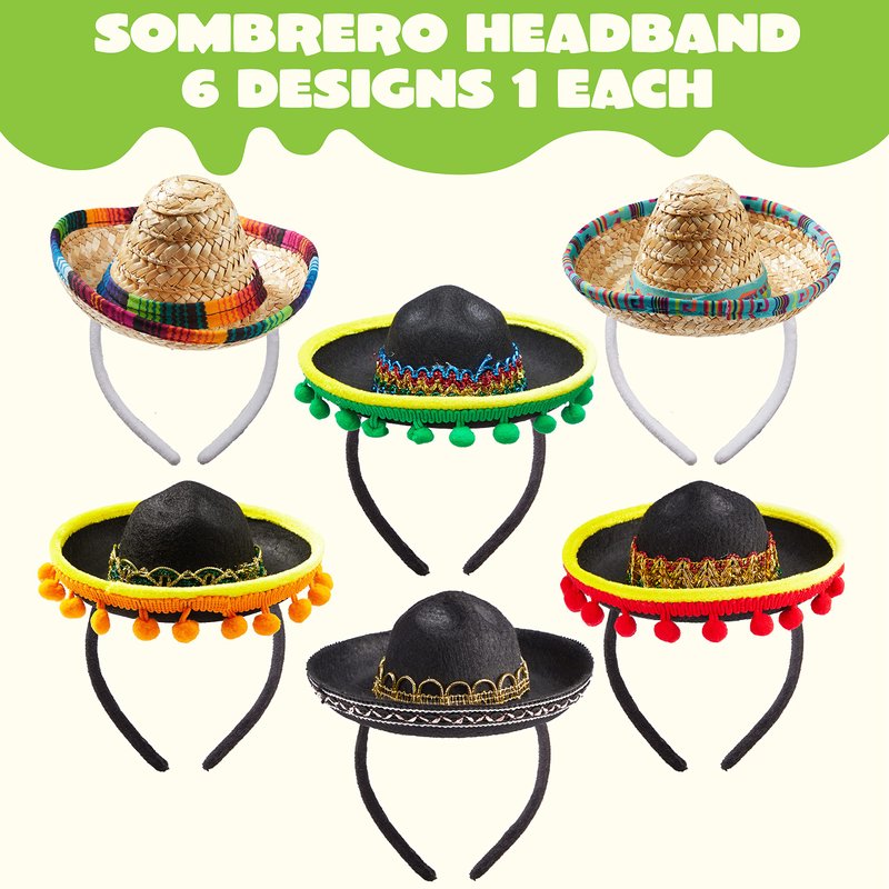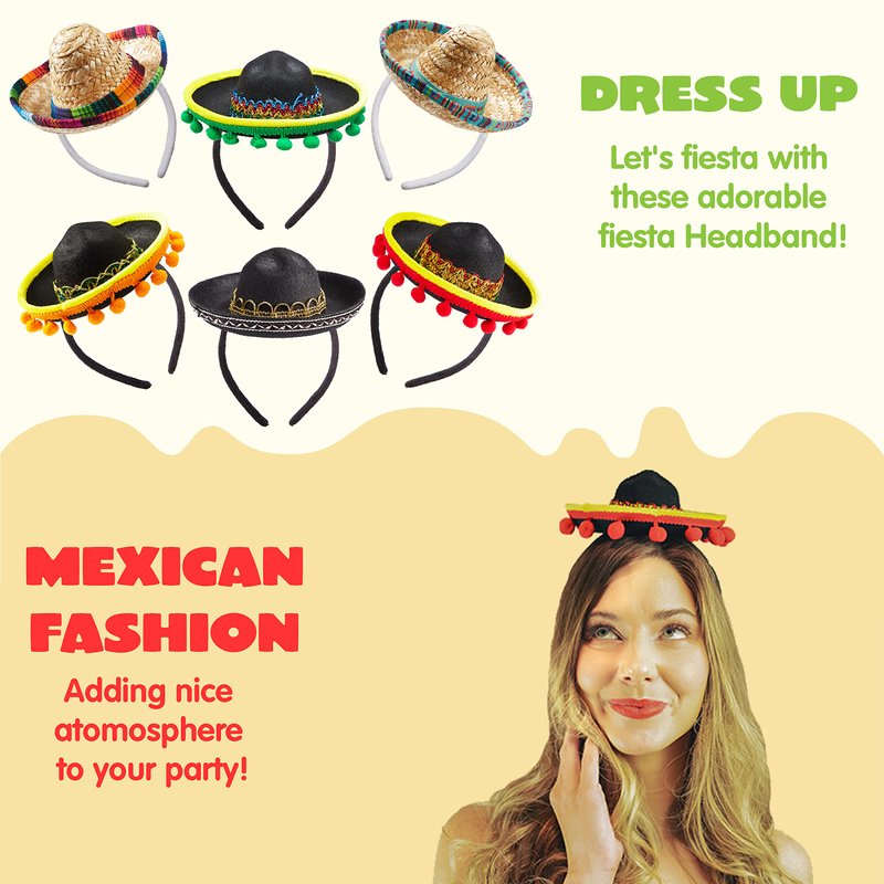 - SUPER VALUE PACK. Our festive headbands include 6 packs of fiesta fabric and straw sombrero headbands. Fabric sombrero headbands feature black flexible headbands with colorful ball fringes and unique patterns on attached sombrero. Straw sombrero headbands feature white flexible headband with Mexican Décor on attached beige straw sombrero.
