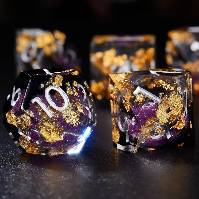Immerse in every storyline with the Joylord Sharp Edge Resin Dice Set infused with Liquid Core & Gold Foil Design.