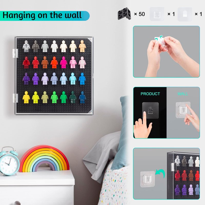 - Secure and Stable: The case includes 50 baseplates (foot supports) for minifigure stability, providing a secure grip for both transport and display. Choose between standing the display case upright or mounting it on a wall using self-adhesive hooks for added safety.