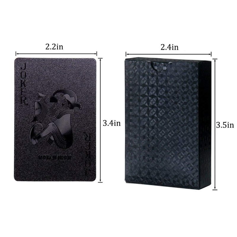 Joyoldelf black gold foil playing cards, give you fascinating feeling and enjoyable playing experience. Comes with gift box, great for take it as a gift for your friends and family on birthday, Christmas Day, Children's Day. More Features -100% brand new and high quality. -Fancy looking cards. -Smooth and flexible, easy to shuffle. -Long serving life. -Unique appearance design. -Waterproof and washable. Specifications Color: black Minimum Player Number:2 Package: a deck of cards Material: environmentally PET Poker Size: 2.2 x 3.4 inch (5.7 x 8.7cm)
