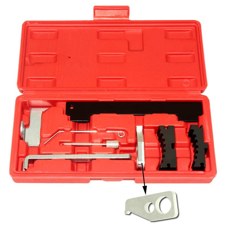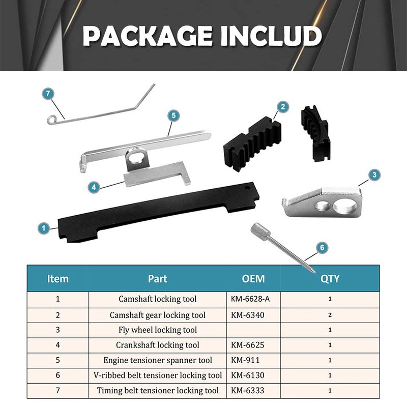 - Package includes 1 Camshaft locking tool, 2 Camshaft gear locking tools, 1 Flywheel locking tool, 1 Engine Tensioner spanner, 1 V-ribbed belt tensioner locking tool, 1 Crankshaft locking tool, 1 Timing belt tensioner locking tool.