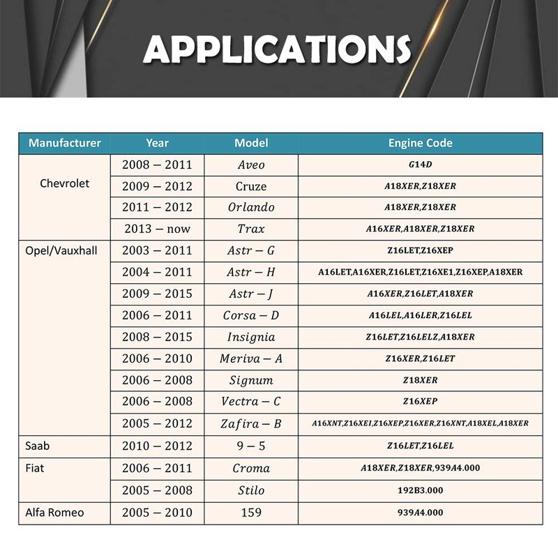 - Compatible with Vehicle: Chevrolet, Fiats and Alfa Romeo 2003 - 2012 16V 1.6 1.8 engine; Astra-G / H / Corsa-D / nsignia / Mervia / Signum / Vectra-C / Zafira-B 2003-2011; Chevrolet Cruze, Orlando 1.4,1.6,1.8 and Fiat Croma, Alfa Romeo 159 with 939A4.000 engines.