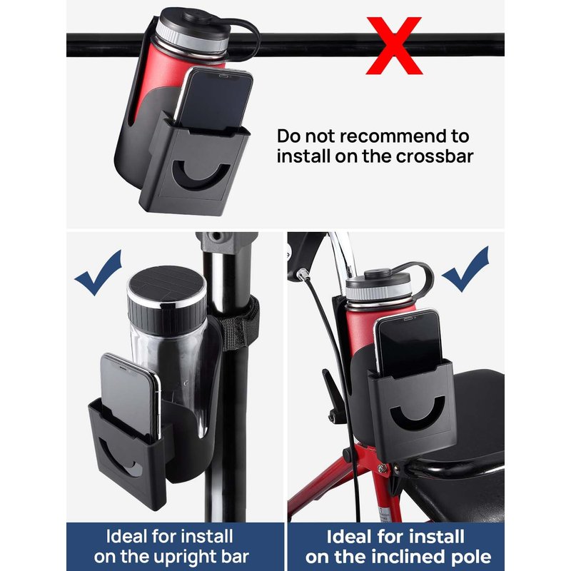 - 【Steady】This rollator cup holder is made of 3MM thick material and an anti-slip strap, making it more sturdy and stable in place. You don't need to worry about your coffee spilling out yet.