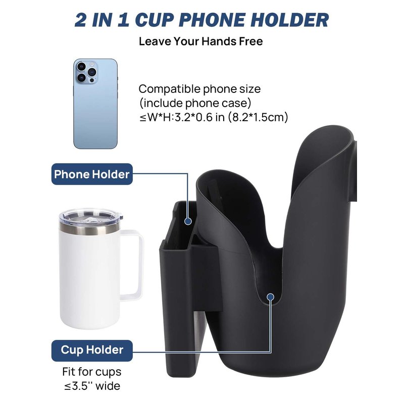 - 【2 In 1 Cup Holder】Only for 2.5"-3.5" diameter of the beverage cup and 3.2" width 0.6" thickness phone(It is recommended to place the phone without a phone case). Upgrade 2 in 1 wheelchair drink holder with a phone bracket. Buy it you have both a cup holder and a phone holder. You can enjoy your beverage while playing on your mobile phone.